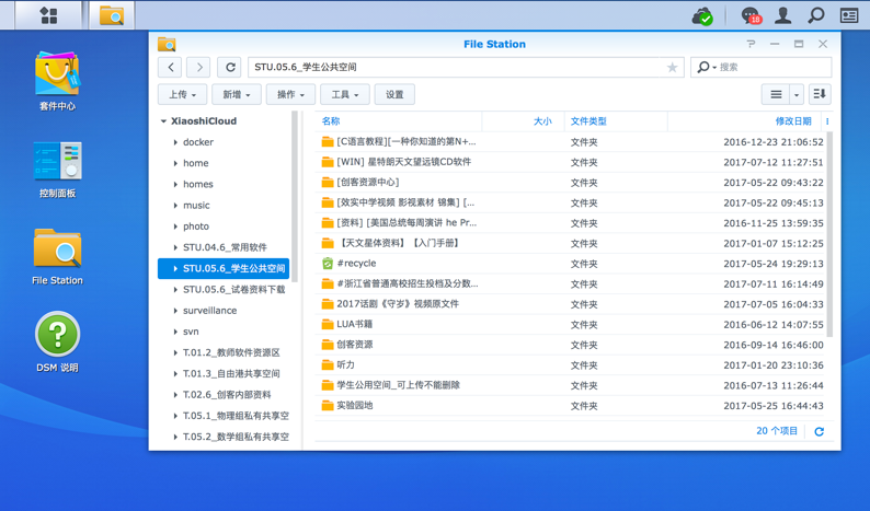 說到資料的整合,這里也不得不說一下資料的存儲與管理。學校因為類別繁復(fù),文件較多且較分散,存放及調(diào)取都非常麻煩。使用 File Station 之后可以非常便利的進行分類并存放文件,全校都可以用來存儲下載文件。通過不同的權(quán)限分配,以及不同功能的文件夾,將不同課目,不同班級等進行整理分類后, 所有文件一目了然。