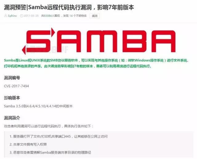【群暉快報(bào)】2017年5月24日Samba發(fā)布了4.6.4版本,修復(fù)了一個(gè)嚴(yán)重的遠(yuǎn)程代碼執(zhí)行漏洞,漏洞編號(hào)CVE-2017-7494。該安全漏洞可以讓一個(gè)有權(quán)限的用戶提權(quán)至Samba所在服務(wù)器的root權(quán)限,進(jìn)而執(zhí)行惡意程序,向該服務(wù)器發(fā)動(dòng)攻擊。